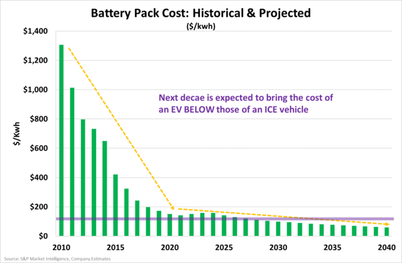 In 1992, a Tesla like battery would’ve set you back a jaw-dropping $450,000. Today, that same battery costs a mere $10,000. And by 2025, thanks to skyrocketing production, it’s expected to drop below $7,500.