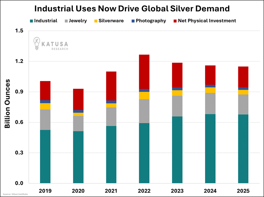 The Silver Institute puts this year’s shortfall at 117 million ounces. Since 2021, the cumulative gap has hit close to 800 million ounces… almost a full year of global production.