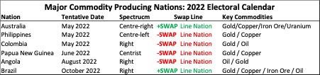 The Australian election is important because the nation is a very large producer of precious and base metals, along with uranium and natural gas.All these industries are carbon-intensive, given the push towards decarbonization.Any new carbon tax legislature on emission caps or restrictions could pose higher costs to miners.Mining in the Philippines continues to be challenging under the current government.In the past, the government-imposed restrictions on new mines, though those have been recently lifted.Open Pit mines were banned but at the end of December, this was redacted.I expect Duterte to remain in power, which makes the nation risky and will continue to be a -SWAP Line Nation.Colombia, Papua New Guinea, and Angola all are -SWAP Line Nations and host large mineral endowments.Historically all three nations have had positive environments for extractive industries, but none are +SWAP Line Nations. Or regions which I deem to be particularly safe compared to other mining-friendly jurisdictions like Canada.