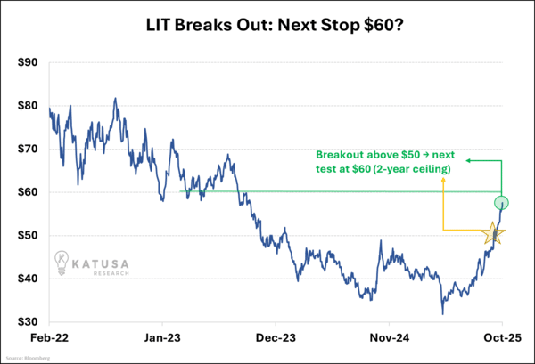 Wave 1: The ETF moves. Institutions need exposure fast. (Now – LIT up 50%)