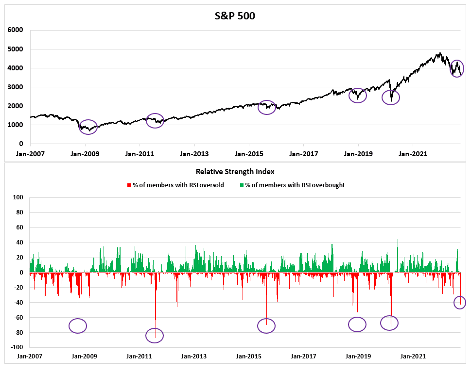 It is easy to get caught up in the day-to-day hype of the markets, especially these days when it is pretty ugly out there.- As you can see in the chart below, based on the Relative Strength Index for S&P 500 companies, we’re nowhere near “capitulation levels”.