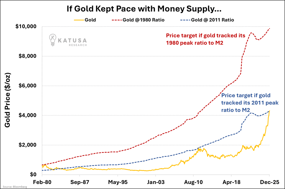 - Matching its 2011 money-supply ratio implies roughly $4,400 per ounce – a level gold has already exceeded.