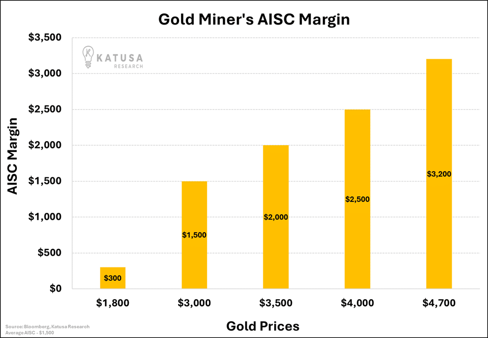 In 2022, when gold sat at $1,800, that margin was closer to $600 (AISC – $1,200). Today’s spread is five times larger.