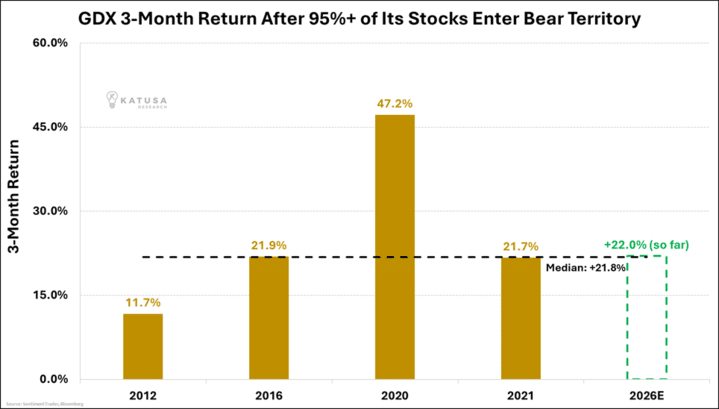 When over 95% of miners in GDX are in bear market territory, GDX’s median return over three months is 21.8%.