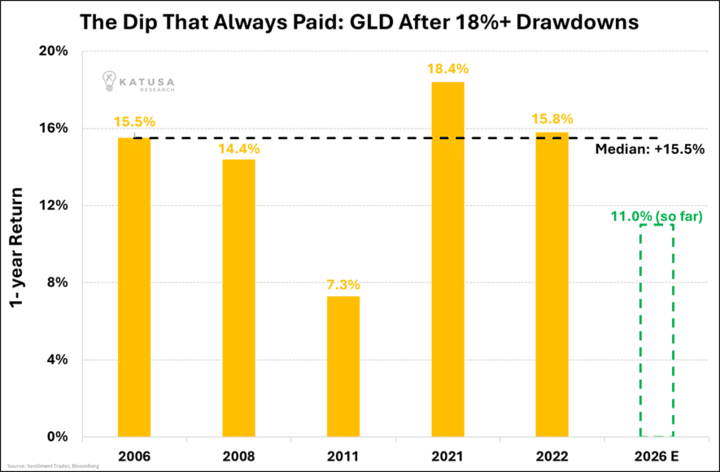 Narrow the filter to the exact condition we are in right now… with GLD more than 18% below its 52-week high and the signal gets louder.