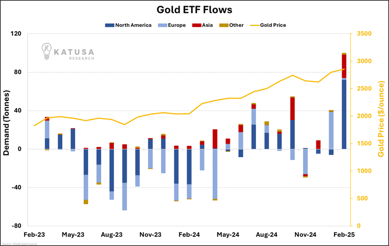 The chart below shows how ETF demand surged across major regions, moving in step with gold’s rise.