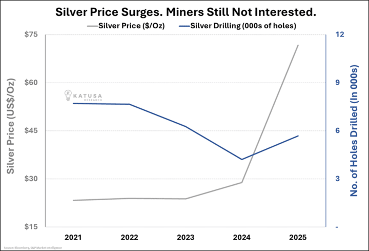 Silver prices have tripled over the last five years, while drilling fell by roughly 25%.