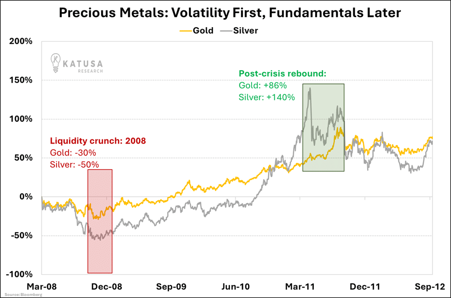 When liquidity tightens, even safe havens sell off early. At the peak of the 2008 crisis, gold fell roughly 30%. Silver collapsed more than 50%. Those declines had nothing to do with long-term value.