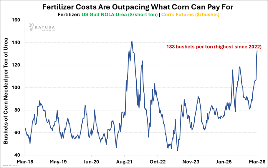 - At current levels, it takes roughly 133 bushels of corn to buy one ton of urea, the highest ratio since the 2022 spike.