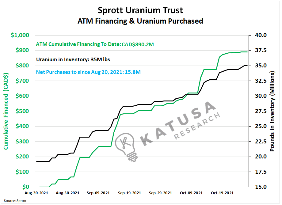 - Since the ATM program began in late August, the trust has taken in nearly CAD$900 million and purchased over 15 million pounds of uranium from the spot market during that time.