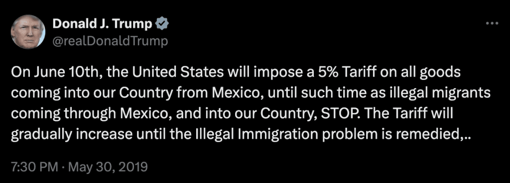 A year later, Trump announced a 5% tariff on Mexican imports, increasing by 5% every month until the border problem was fixed.