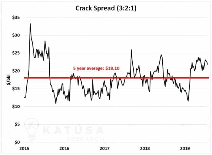 As you can see, the crack spread is well above the five-year average. And it has recently spiked from $12 to nearly $25 per barrel.