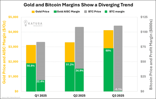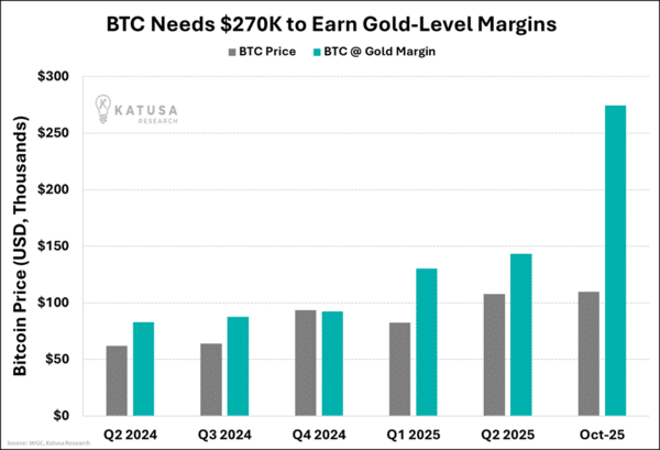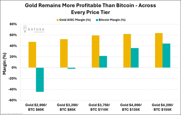 • Bitcoin would need to trade near $270,000 per bitcoin just to match the average margins current gold producers enjoy right now at $4,000 spot gold.