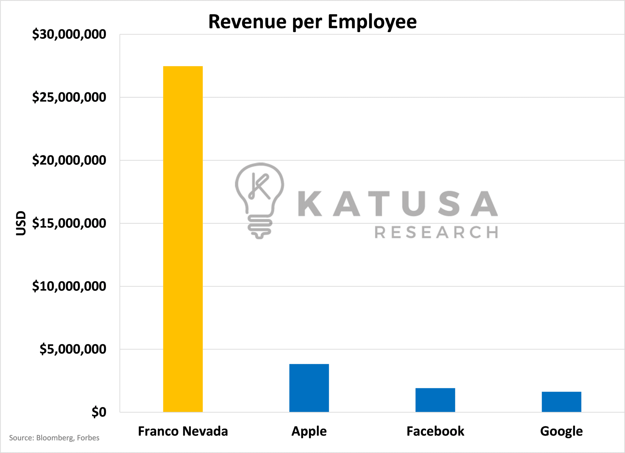 They just try to put their money where the gold is. And, in their case, it paid off tremendously for Franco-Nevada. Today, Franco-Nevada makes more revenue per employee than Apple, Facebook, or Google, in fact, more than those three combined!