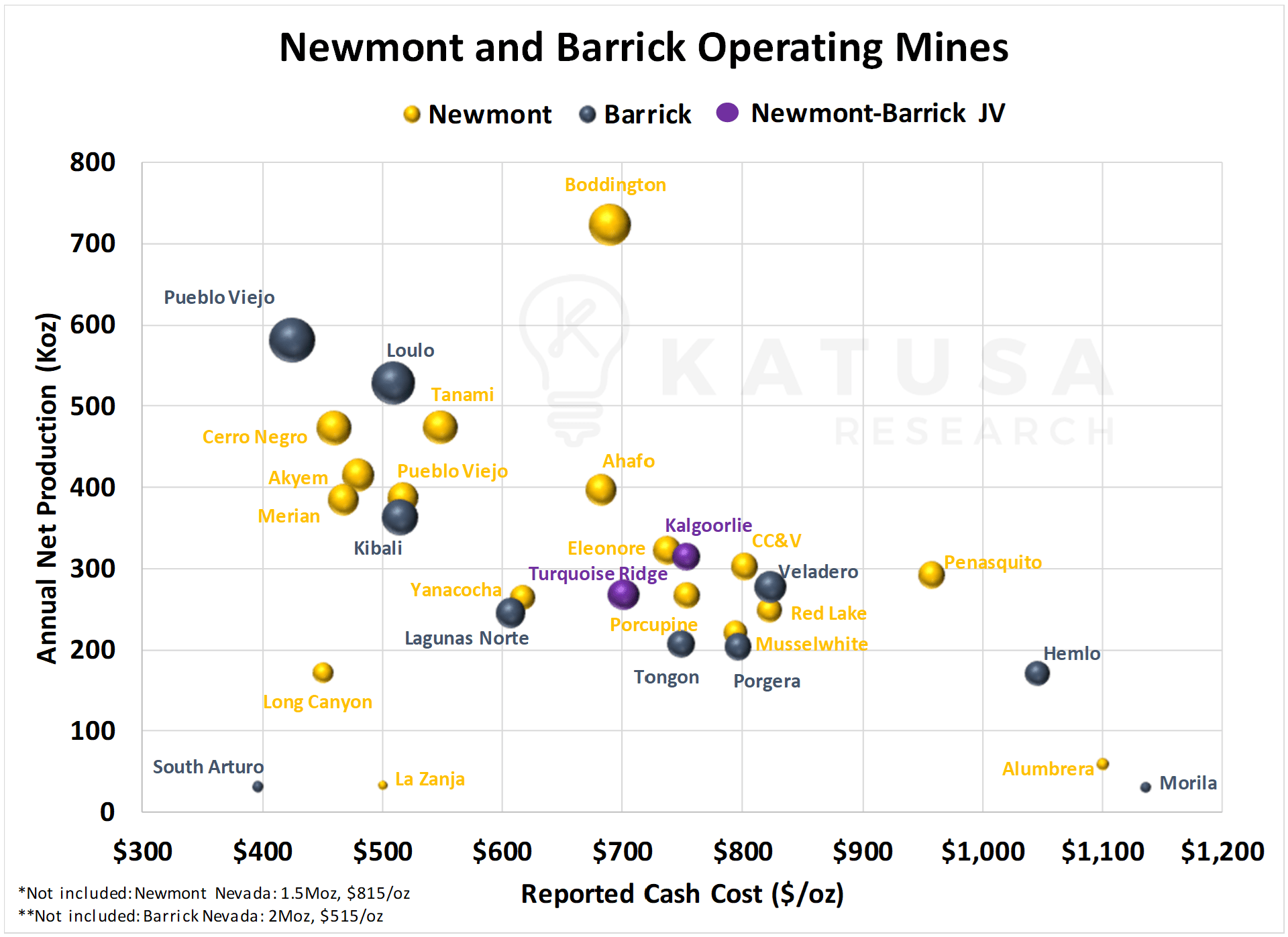 Below is a chart which shows the operating mines of Newmont and Barrick. The yellow dots are Newmont, and grey are Barrick. The purple represents joint-ventures between the 2 companies.