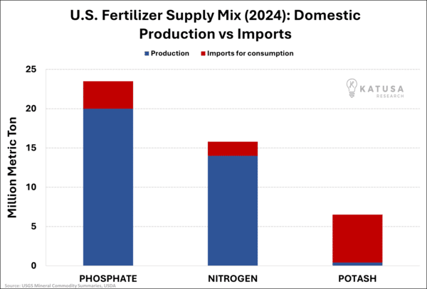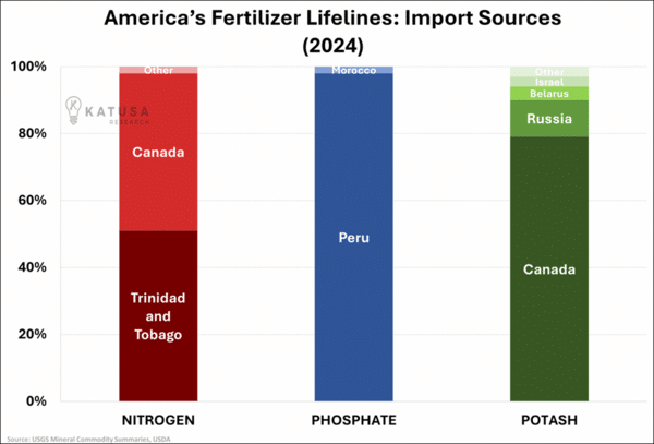 The United States produces just 9% of the world’s nitrogen and 8% of global phosphate. In potash? It barely registers.