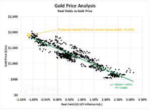 The next chart paints a very clear picture of the relationship between “real” interest rates and the gold price. This data goes back to 2006, where each dot represents the weekly gold price and associated real interest rate.
