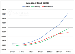 The chart below shows the current yields for bonds in France, Germany, and Switzerland. Everything short and medium-term duration is below zero…