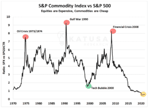 Commodities investing requires a contrarian strategy. It’s one reason why many on Wall Street shun the sector. Jumping on the meme FOMO bandwagon is a lot easier. These days, commodities relative to stocks, have never been cheaper.