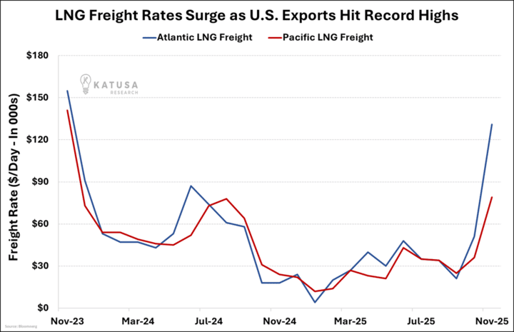 - Atlantic LNG freight rates climbed to $131,000 per day, the highest level in two years. It now costs 1.65 times the Pacific route.