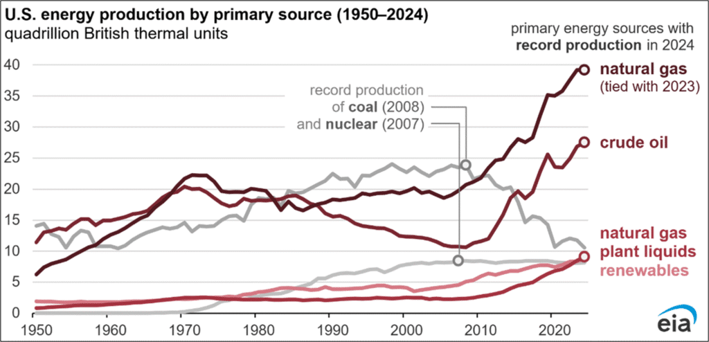 Natural gas drives that dominance with 38% of total U.S. energy production in 2024. Gas has ruled domestic output since overtaking coal in 2011.